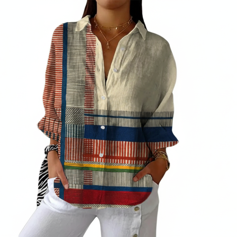 Natalie | Kunstiline Muster Särk on elav segu abstraktsetest triipudest ja mängulistest värvipaneelidest, muutes selle ideaalseks naistele, kes armastavad end stiilselt väljendada. Särk toob kaasa kunstilise hõngu, mis tundub kaasaegne, kuid samas lõdvestunud, ideaalne juhuslikeks lõunateks, galeriide külastamiseks või igapäevase välimuse värskendamiseks.