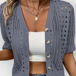 Veronika suvine kardigan on ideaalne kerge kiht üleminekuhooaegadeks või jahedateks suveõhtuteks. Pehme tekstuuri ja lühikeste varrukatega lisab see igale riietusele pingutuseta võlu ja mugavust. Mitmekülgne ja oluline garderoobi alus.
